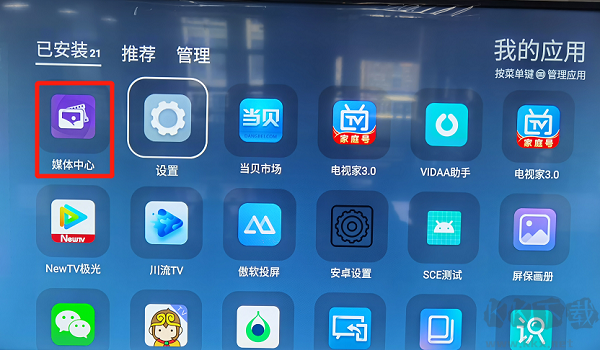 3、打開(kāi)商場(chǎng)模式后,打開(kāi) 我的應(yīng)用—媒體中心—找到安裝包,這時(shí)點(diǎn)擊安裝安裝包,安裝好就可以觀看啦。