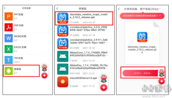 5、點(diǎn)擊文件投屏后,點(diǎn)擊 安裝包,點(diǎn)擊剛才下載的 電視家3.0安裝包,點(diǎn)擊 開(kāi)始投屏,電視上就開(kāi)始接收了,接收成功后就可以打開(kāi)使用啦