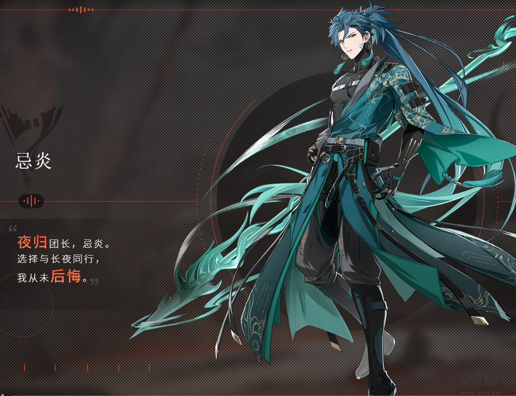 忌炎-夜歸團長,心懷大意,雷厲風(fēng)行,能聚龍槍,定風(fēng)場。他常年率領(lǐng)夜歸奮戰(zhàn)在抗擊悲鳴的第一線,見證過這個世界最為真實冷酷的一面。他總是在做選擇,即使這些選擇令他感到疼苦,他也從未迷失方向。