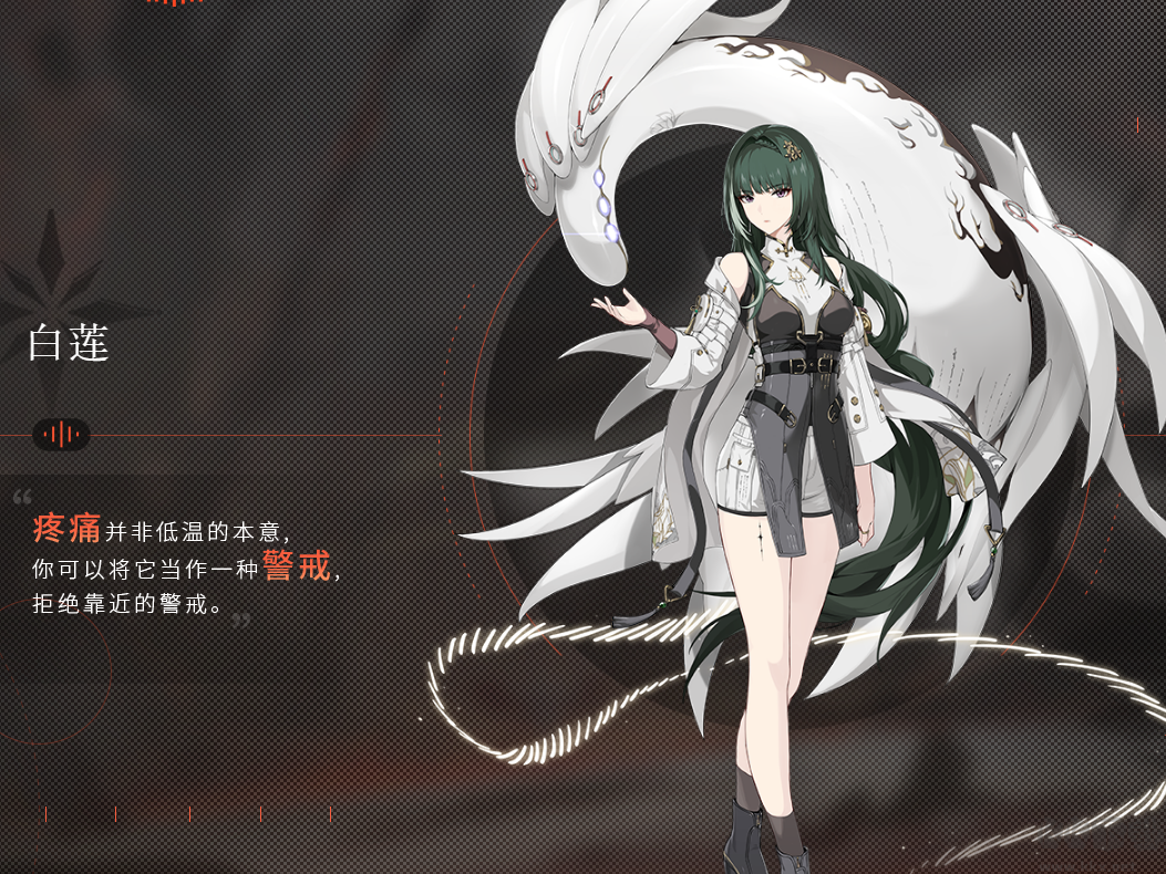 白蓮-皇龍研究院的考古學(xué)家,習(xí)慣孤身一人探索遺跡。優(yōu)懼感情的不可預(yù)見性,抗拒可能的變故與代價,因此率先劃下理性的界限。厭惡陷入各種麻煩,奉行著“自己對自己負責(zé)”的極端理性原則。但是倘若遇見陷入危險的人,她也無法坐視不理。