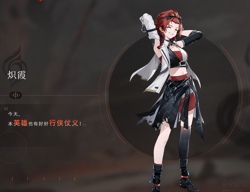 熾霞-天工成員,自詡正義伙伴,永遠活力滿滿地傳俊在天城的大街小巷??梢曰療崆闉閺椝?,她的熱情就像她的彈藥一樣永不止息。哪里有需要幫助的人,哪里就有她的身影。