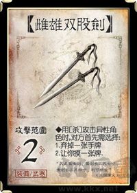 距離2,當(dāng)你使用【殺】造成傷害時(shí),你可以防止此傷害,改為棄置該目標(biāo)角色的兩張牌(棄完第一張?jiān)贄壍诙?。這讓魏國(guó)自殘流以及小喬一干人等無(wú)比的抑郁,這就是想賣血都賣不成的悲劇- -這把武器說的容易點(diǎn)就是你殺對(duì)方時(shí)可以先詢問是否命中,得到肯定答復(fù)后,可以有傷害其1點(diǎn)體力的另一種方式,即對(duì)其使用2張【過河拆橋】,可以對(duì)其手牌和裝備牌任意的拆遷,常見作用有是防止司馬的反饋以及幫助隊(duì)友拆掉敵人的裝備比如八卦+1馬啥的。