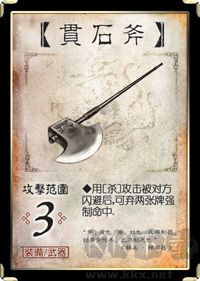 許褚神器,憋牌幾輪就是為了這把武器的強(qiáng)制命中,當(dāng)然同樣可以作為【諸葛連弩】攻擊的前奏,手牌多的武將用起來很不錯(cuò),尤其對(duì)方覺得自己有閃有八卦正美的鼻涕冒泡的時(shí)候,不要想了,把自己多余要棄掉的手牌扔掉,變廢為寶,化作一記重?fù)?,連著鼻涕泡把鼻血一起打出來。孫尚香使用貫石斧時(shí),可以棄掉自己的馬摸牌。