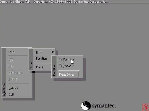 3、GHOST是英文的風(fēng)們使用鍵盤選擇 Load——>>Partition——>>To Image (分區(qū)到鏡像)