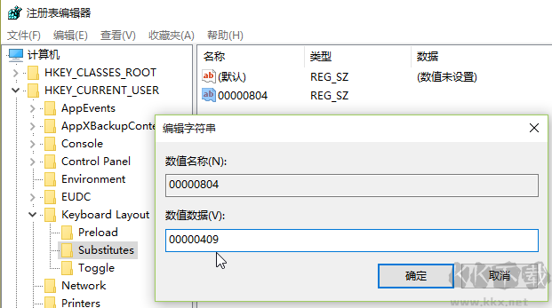3、打開注冊(cè)編輯器:HKEY_CURRENT_USER\Keyboard\Layout\Preload,修改“1”的鍵值為“00000804”,然后在Substitutes項(xiàng)中新建字符串值,名稱為“00000804”,鍵值為“00000409”,關(guān)閉注冊(cè)編輯器,注銷后重新登錄。