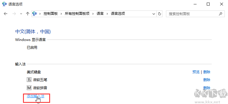 打開控制面板---時(shí)鐘、語言和區(qū)域---語言,會(huì)看到已經(jīng)添加了“中文”,并且鍵盤布局是“美式鍵盤”,點(diǎn)擊中文的選項(xiàng)---添加輸入法,添加所需要的中文輸入法---保存。