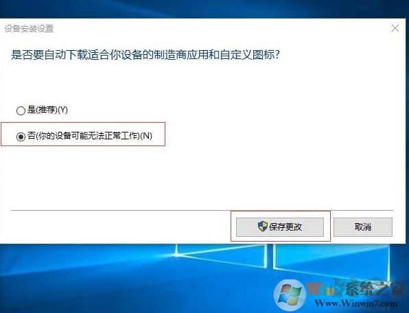 2、在系統(tǒng)屬性-硬件-設(shè)備安裝設(shè)置-是否要自動(dòng)下載適合你設(shè)備的制造商應(yīng)用和自定義圖標(biāo),選擇 否 確認(rèn)。
