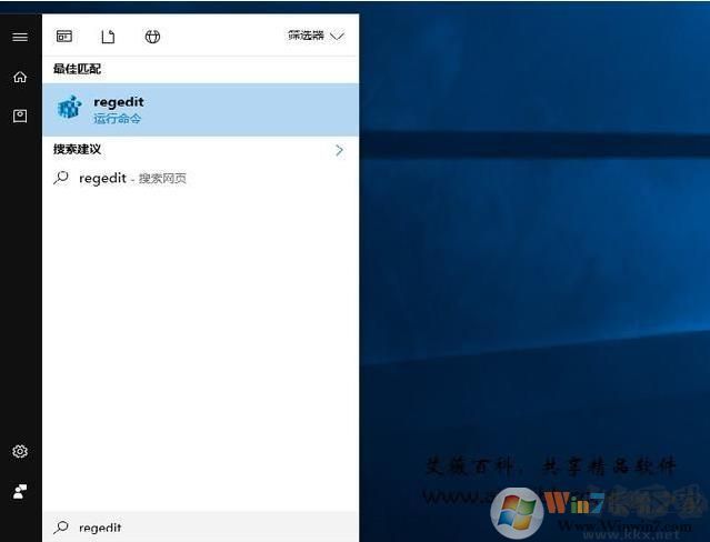 1、首先我們要打開(kāi)注冊(cè)表編輯器,如下圖是Win10系統(tǒng)。在Windows 10中點(diǎn)擊屏幕左下角的Windows圖標(biāo),輸入regedit并回車(chē)打開(kāi)注冊(cè)表編輯器。