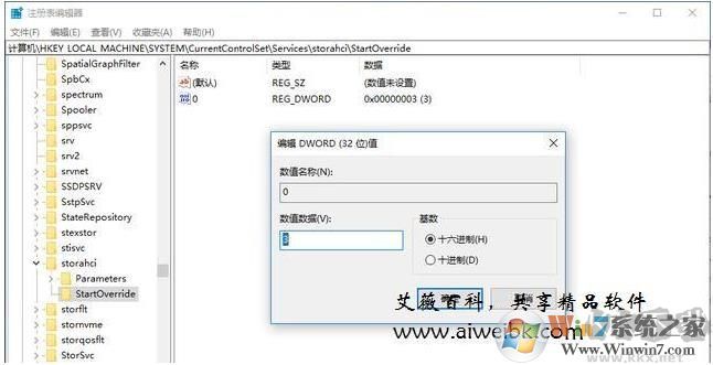 2、在注冊(cè)表編輯器當(dāng)中依次展開(kāi)HKEY_LOCAL_MACHINE\SYSTEM\CurrentControlSet\Services\storahci\StartOverride,找到右側(cè)名為0的項(xiàng)目,將其值從3修改為0,然后點(diǎn)擊確定,最后關(guān)閉注冊(cè)表編輯器。