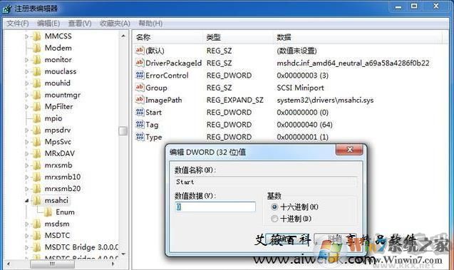 Windows 7與Windows 10略有不同,用戶(hù)需要在開(kāi)始菜單中輸入regedit回車(chē),打開(kāi)注冊(cè)表編輯器,依次展開(kāi)HKEY_LOCAL_MACHINE\SYSTEM\CurrentControlSet\services\msachi,雙擊右側(cè)的Start項(xiàng),將起數(shù)值改為0: