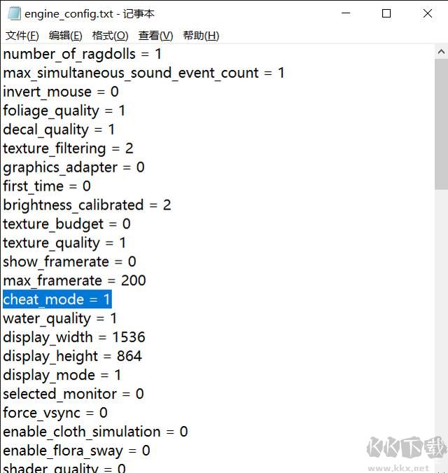 最后在engine_config的文本中找到 cheat_mode = 0 這條數(shù)據(jù),將0改為1,再次進入游戲,就會發(fā)現(xiàn)游戲的作弊模式已經(jīng)啟動啦~