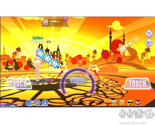 左邊掉落的星星點(diǎn)擊左邊touch鍵,右邊掉落的星星點(diǎn)擊右邊touch鍵。藍(lán)色的星星-單擊、黃色的星星-連擊、粉色的星星-雙擊,按照規(guī)則即可得分。