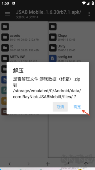 7、選擇左邊的游戲數(shù)據(jù).zip,解壓到右邊并點(diǎn)擊確定。